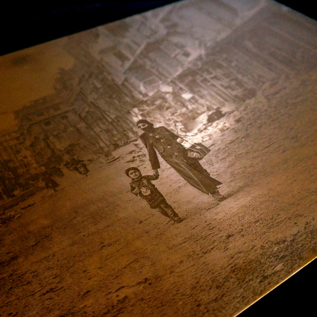 L’héliogravure au grain est un procédé photomécanique créé au XIX° siècle, par Nièpce, Poitevin, Talbot et porté à maturité en 1876 par Karl Klic. Inscrite dans le monde de l’estampe et de la photographie, l’héliogravure présente des noirs d’une profondeur presque palpable, des densités de gris d’une grande subtilité qui ont séduit des photographes illustres tels qu’Alfred Stieglitz ou Edward Curtis. Pour Marie Levoyet, l’héliogravure est un cheminement nourri de la rencontres avec les artistes, de l’histoire des images, du cuivre, de l’encre, des matières, des gestes et de la lumière, Helio en grec ancien.